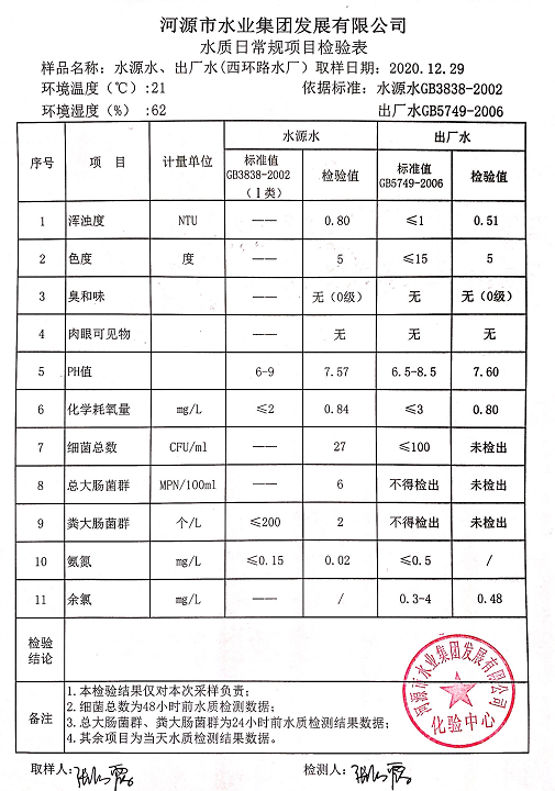 2020年12月29日水質(zhì)檢驗報告