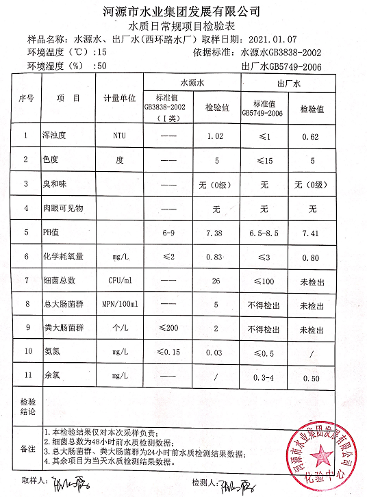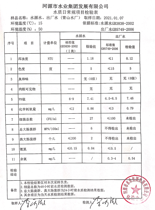 2021年1月7日水質檢驗報告