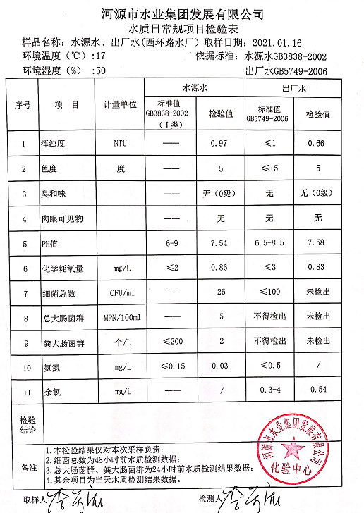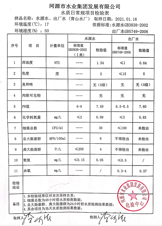 2021年1月16日水質(zhì)檢驗(yàn)報告