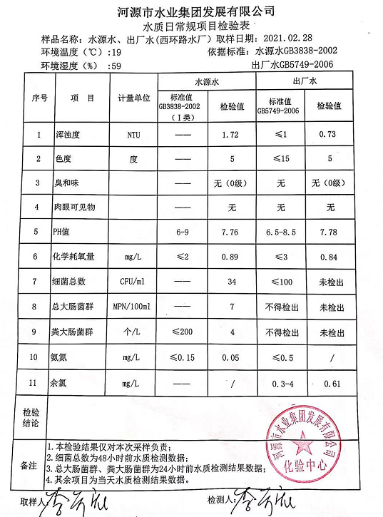 2021年2月28日水質(zhì)檢驗(yàn)報告
