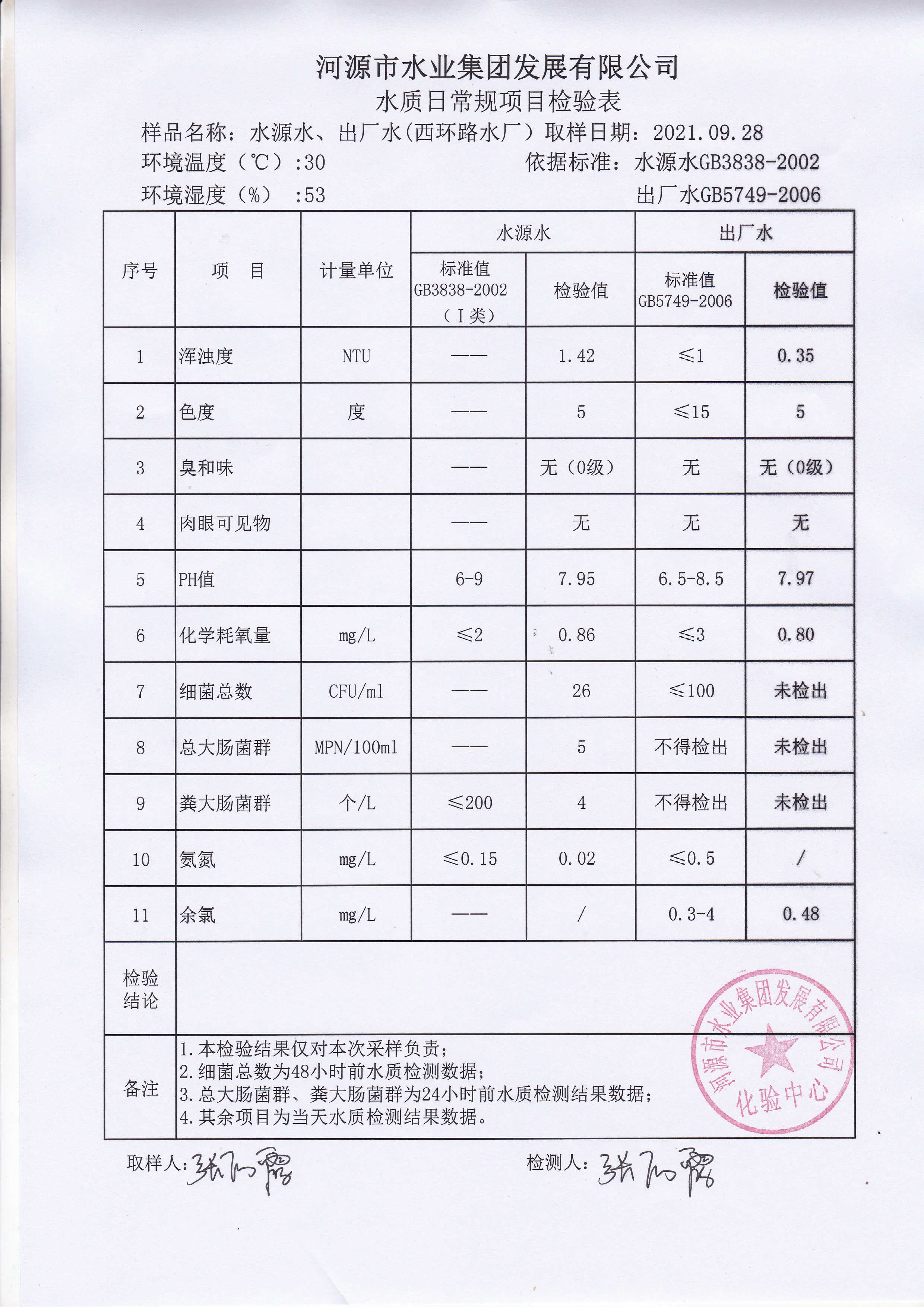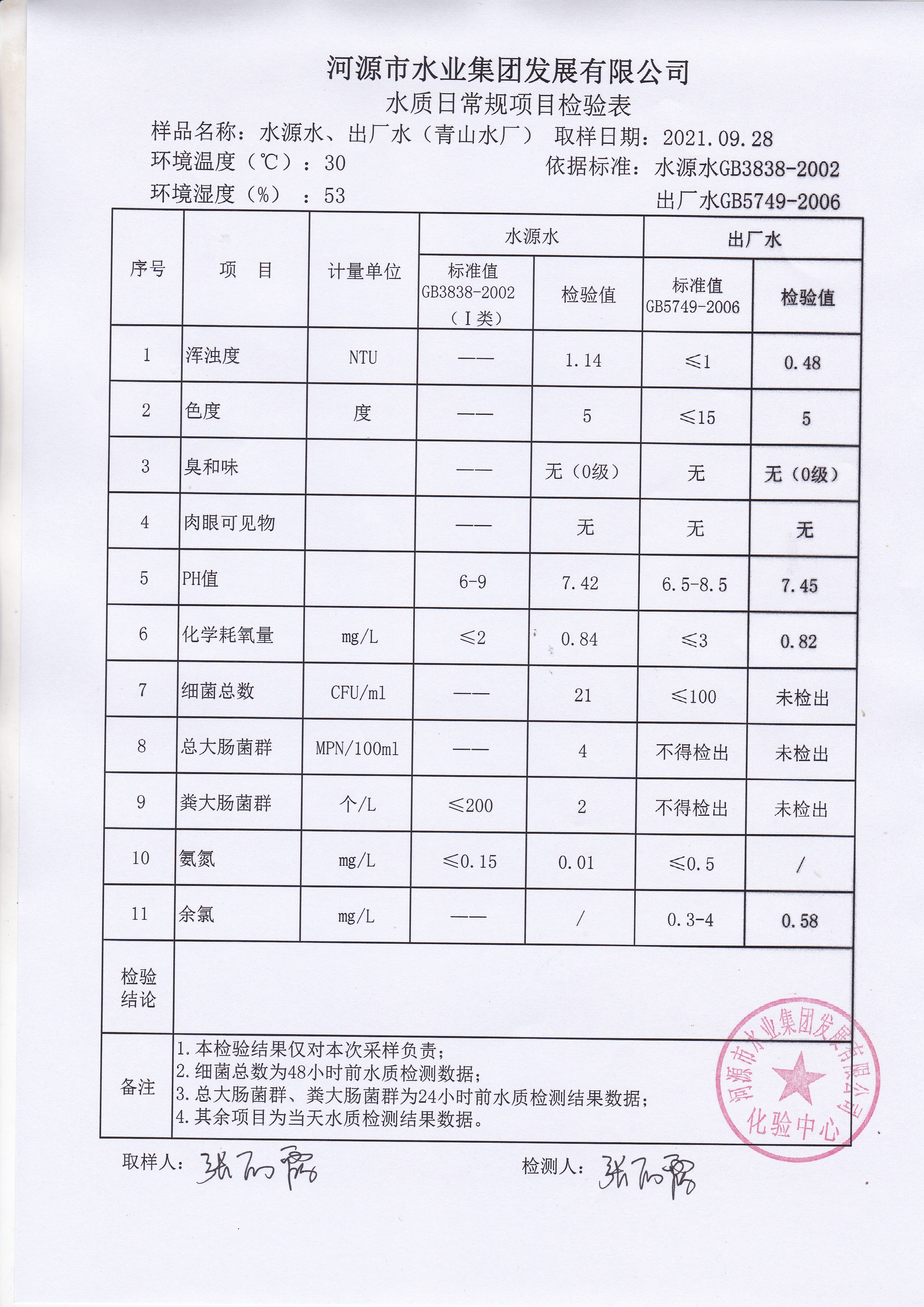 2021年9月28日水質(zhì)檢驗(yàn)報告