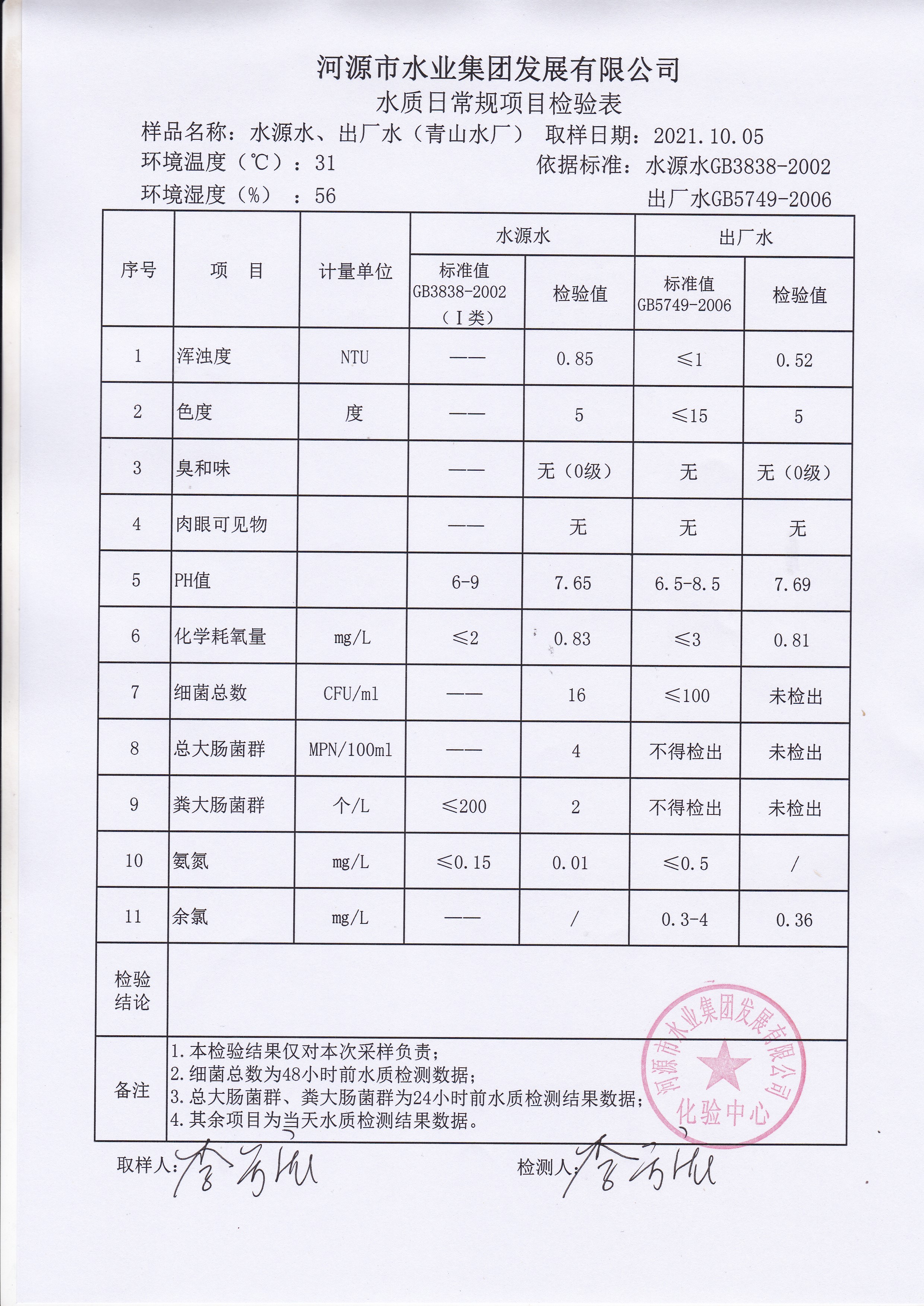 2021年10月5日水質(zhì)檢驗(yàn)報(bào)告