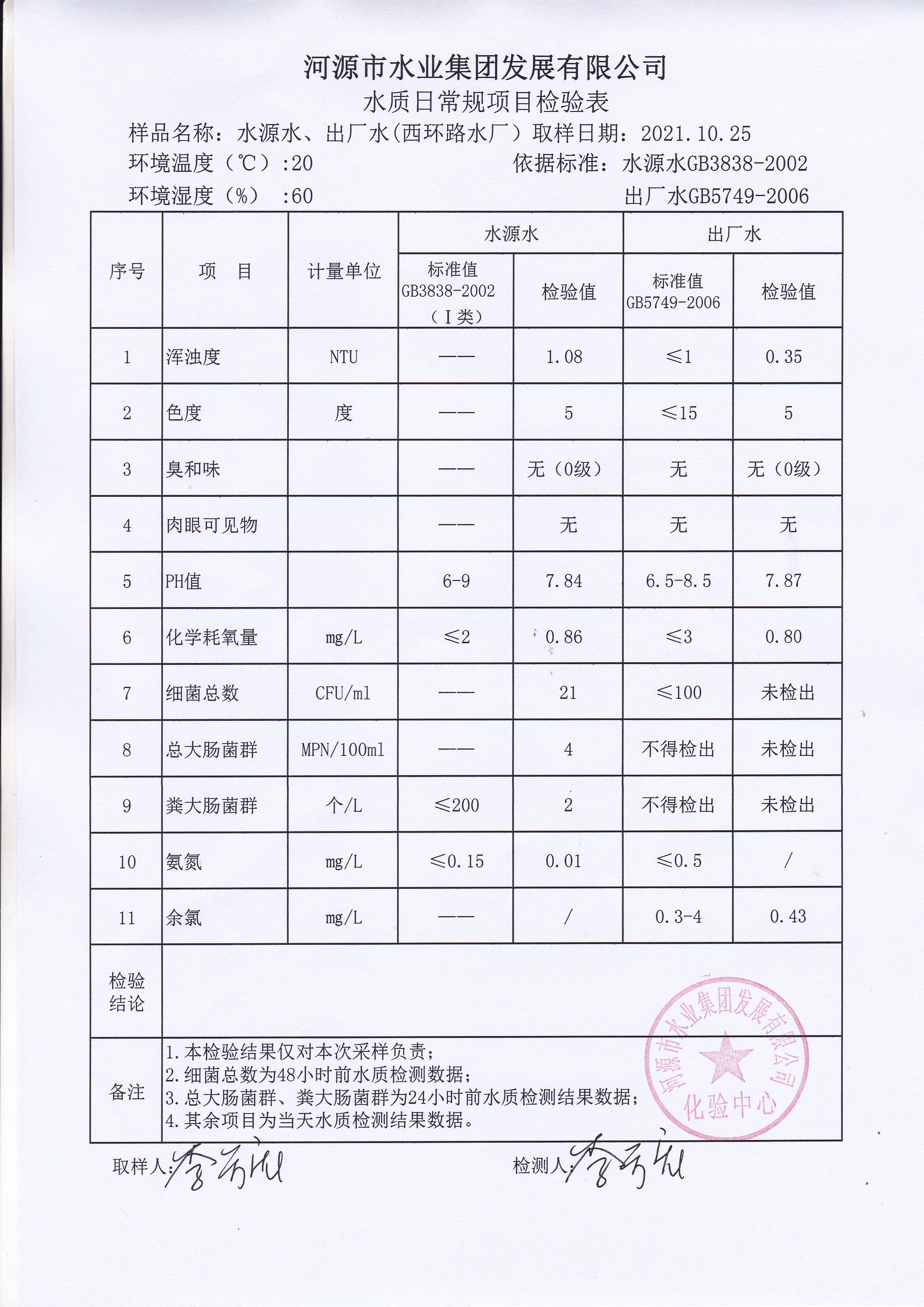 2021年10月25日水質(zhì)檢驗報告