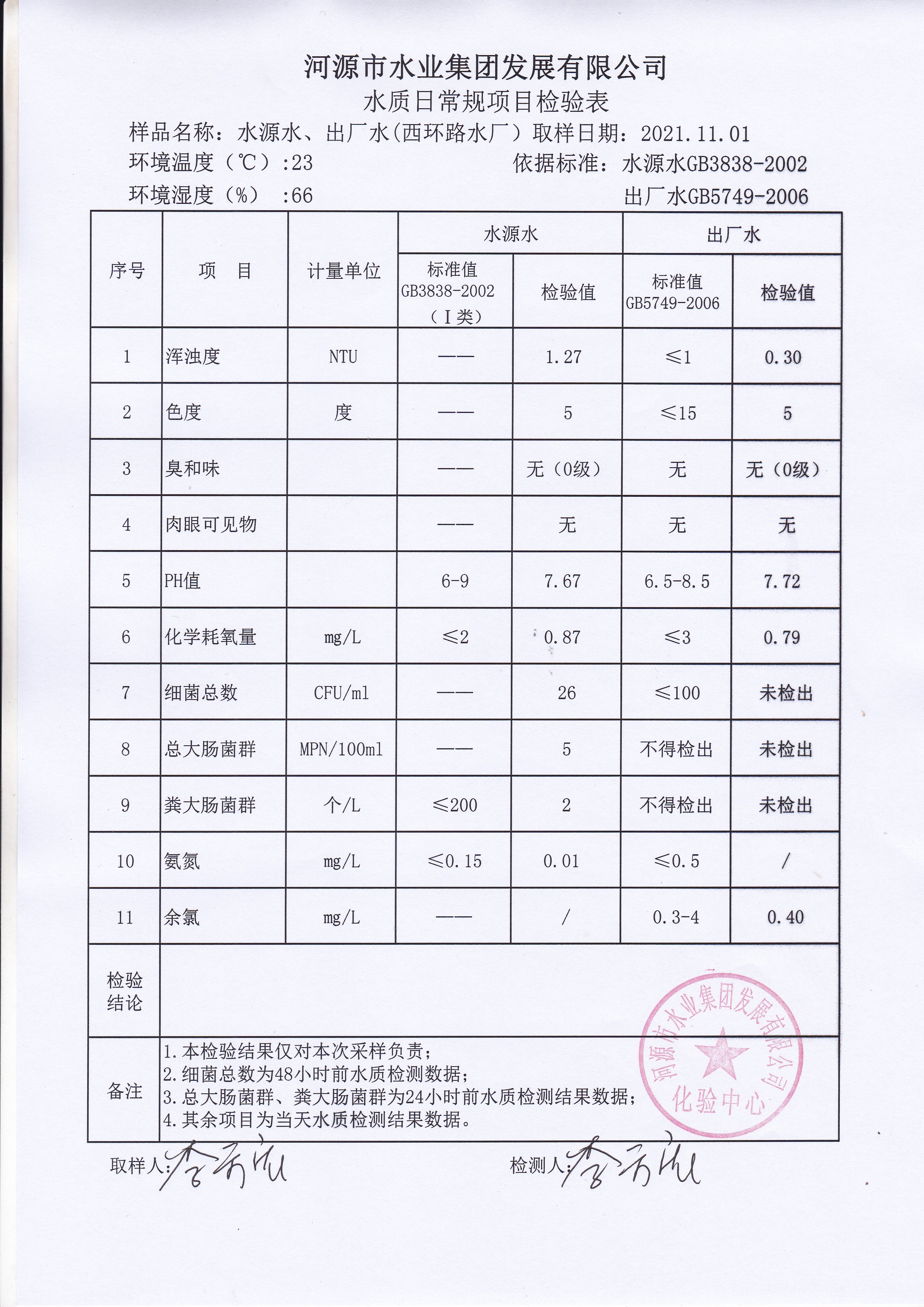 2021年11月1日水質(zhì)檢驗(yàn)報(bào)告