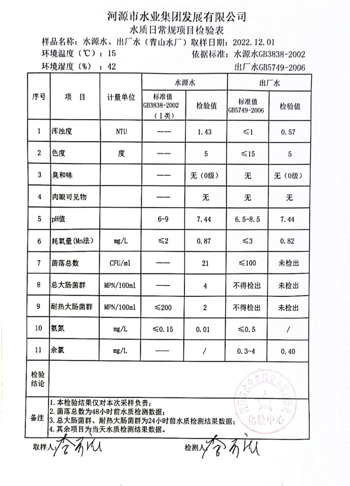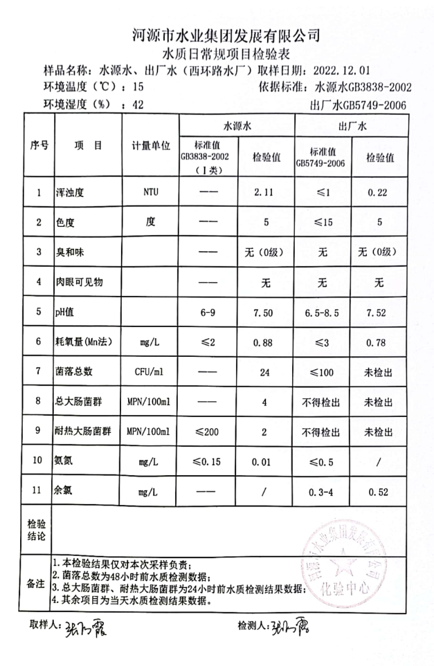 2022年12月1日水質(zhì)檢驗(yàn)報告