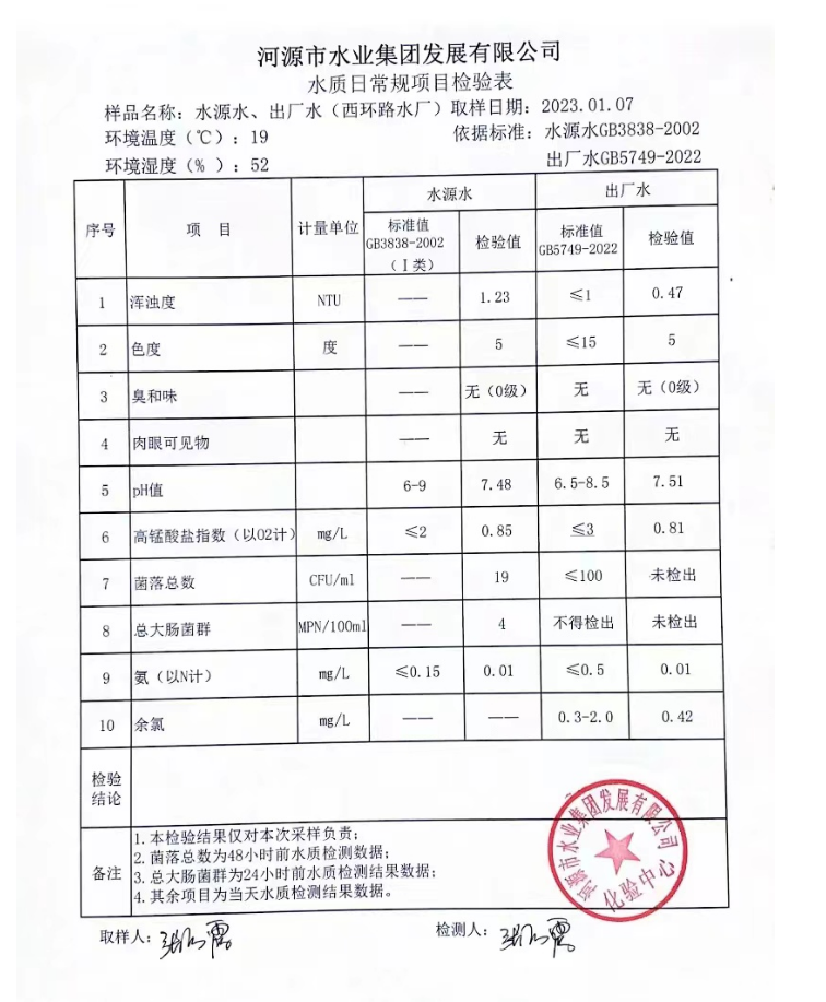 2023年1月7日水質(zhì)檢驗報告