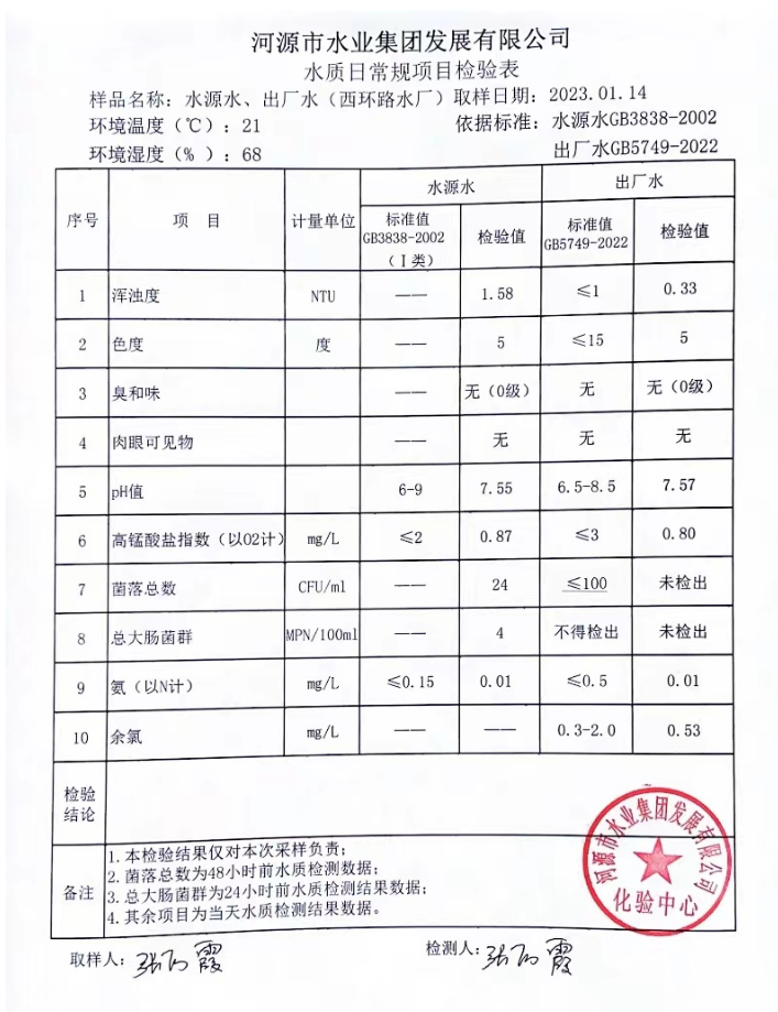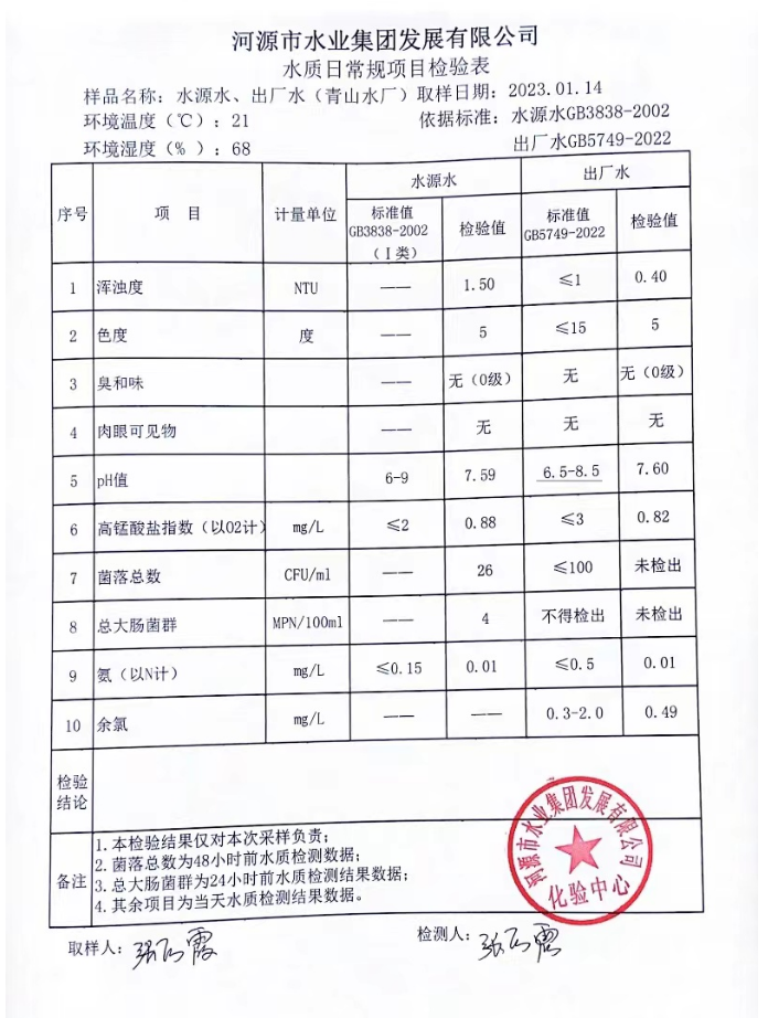 2023年1月14日水質(zhì)檢驗(yàn)報告