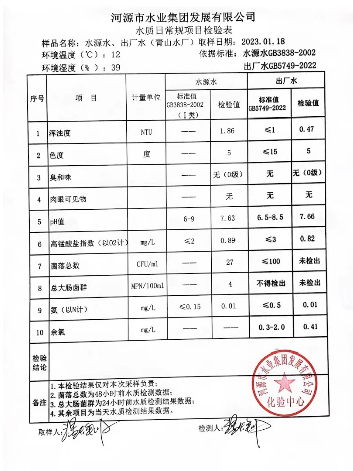 2023年1月18日水質(zhì)檢驗(yàn)報(bào)告