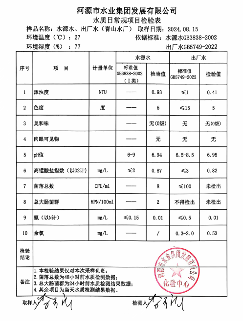 2024年8月15日水質(zhì)檢驗(yàn)報(bào)告