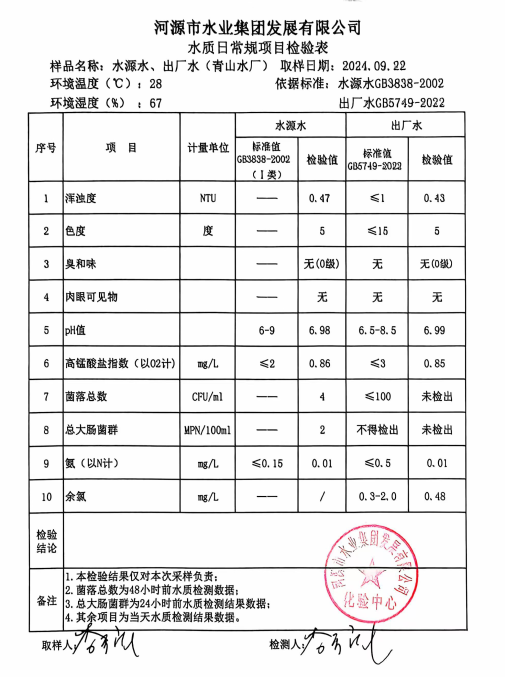 2024年9月22日水質(zhì)檢驗(yàn)報(bào)告